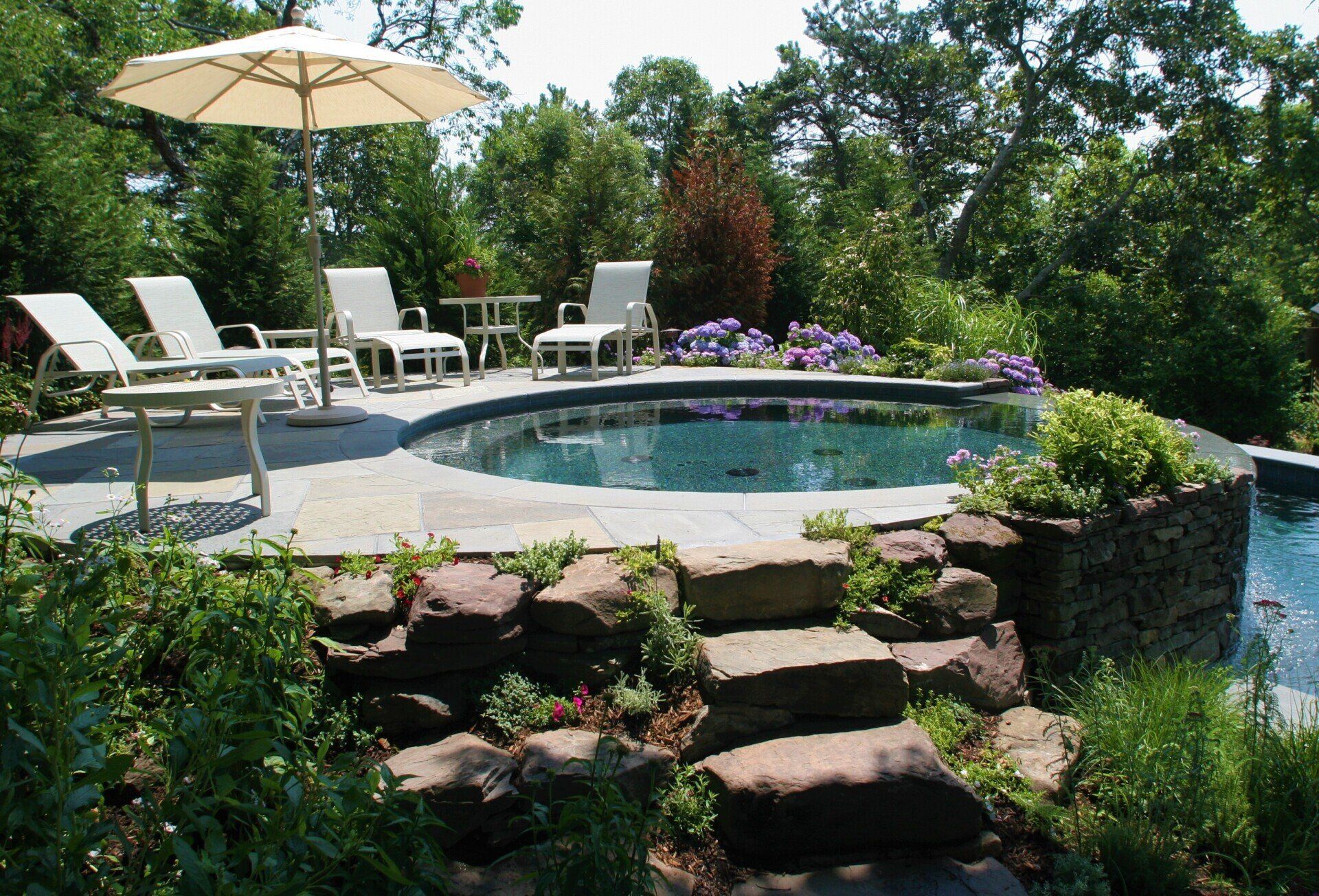 Surrounded by gardens and views of the bay, this pool with a hot tub delights all. It complements a nearby patio and multiple skillfully designed and maintained perennial gardens.