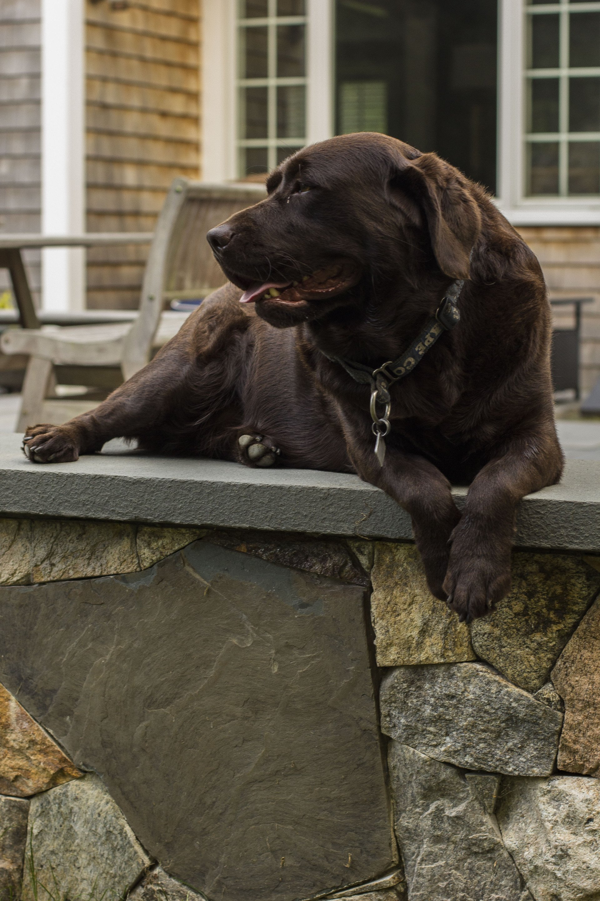 This wall with bluestone coping surrounds a large porcelain patio with room for all including the family dog to stretch out and relax.